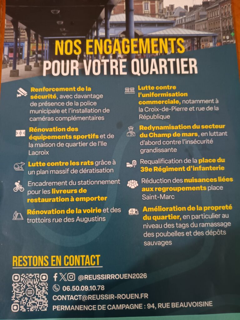 Ainsi, la candidate du conservatisme rouennais ne prend même pas de détour pour désigner ses ennemis : A savoir les rats et les commerces issus de l’immigration. Réunis dans un même tracts sous la thématique » Nos engagements pour votre quartier », la candidate continue de provoquer en usant de messages subliminaux. On s’en passerait bien dans une démocratie !